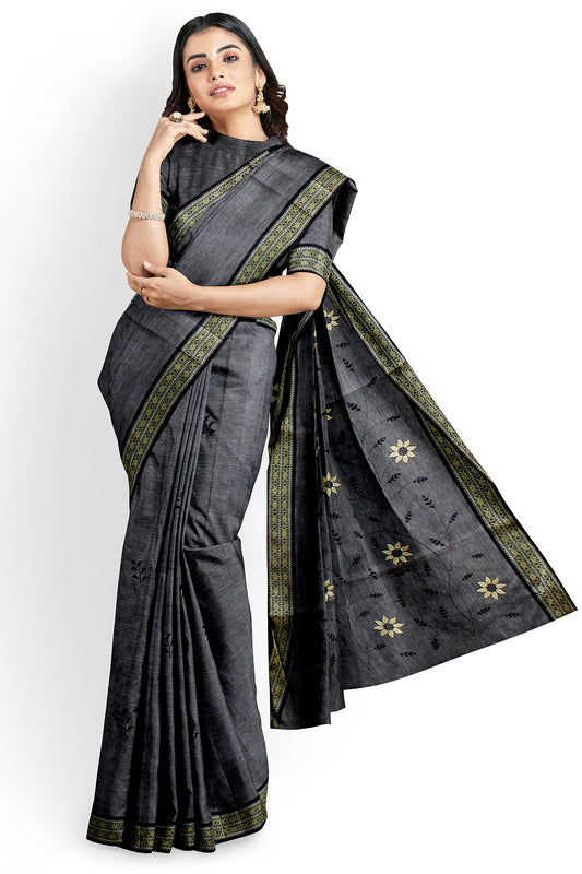 Dark Gray Cotton Saree with Floral Motifs and Contrasting Border