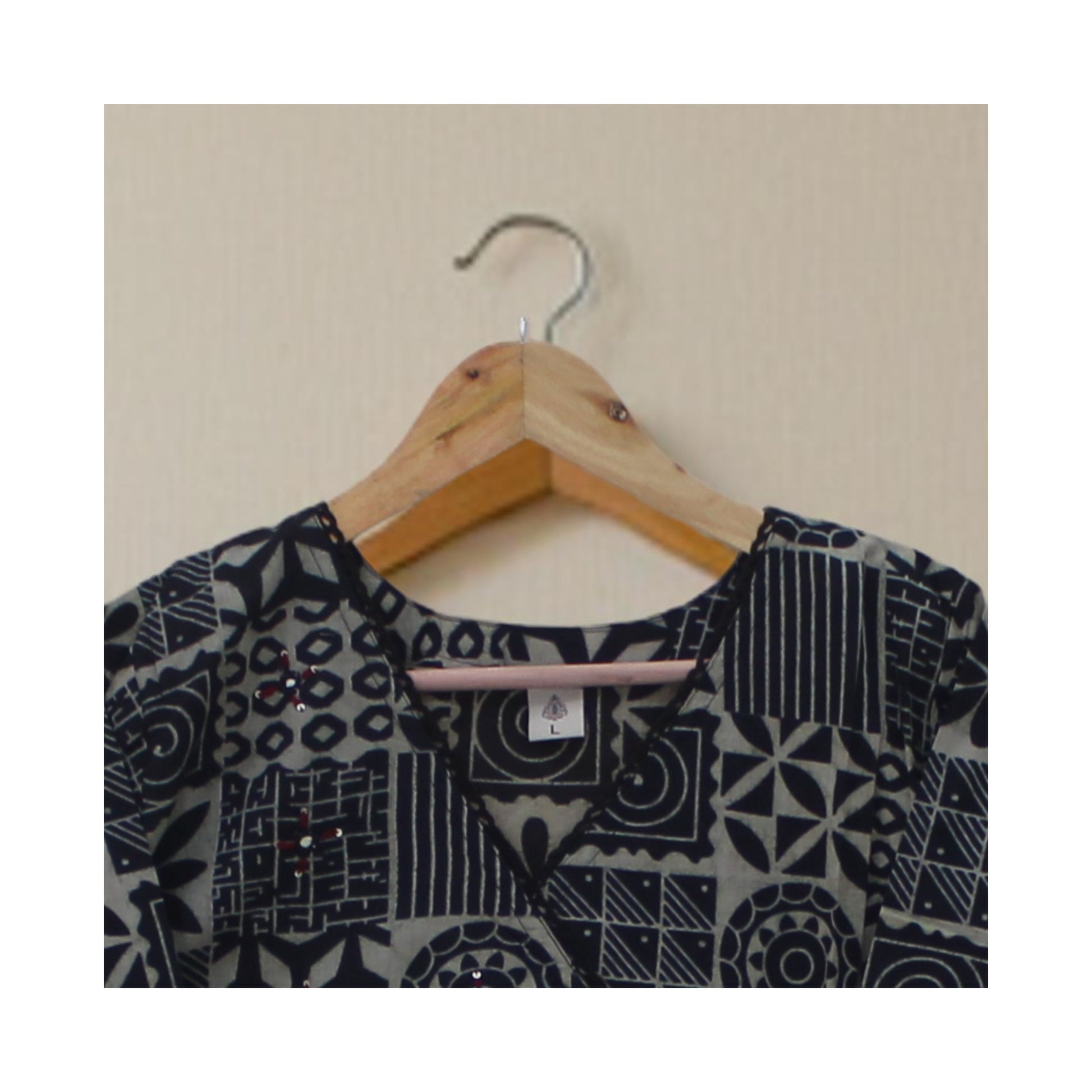 Embrace an artisanal, ethnic look with our striking Geometric Block Print Angrakha Kurta. This piece features a beautiful all-over geometric pattern in contrasting black/indigo and beige tones, resembling traditional block printing (like Dabu). The flattering faux wrap design is fixed but is embellished with a decorative side tie featuring small red tassels, adding a pop of color and movement. The front yoke is further enhanced by subtle sequin/bead work in red and silver, giving the ethnic print a delicate shimmer. This stylish, straight-cut kurta (Size L) is perfect for elevating your everyday or casual festive wear.