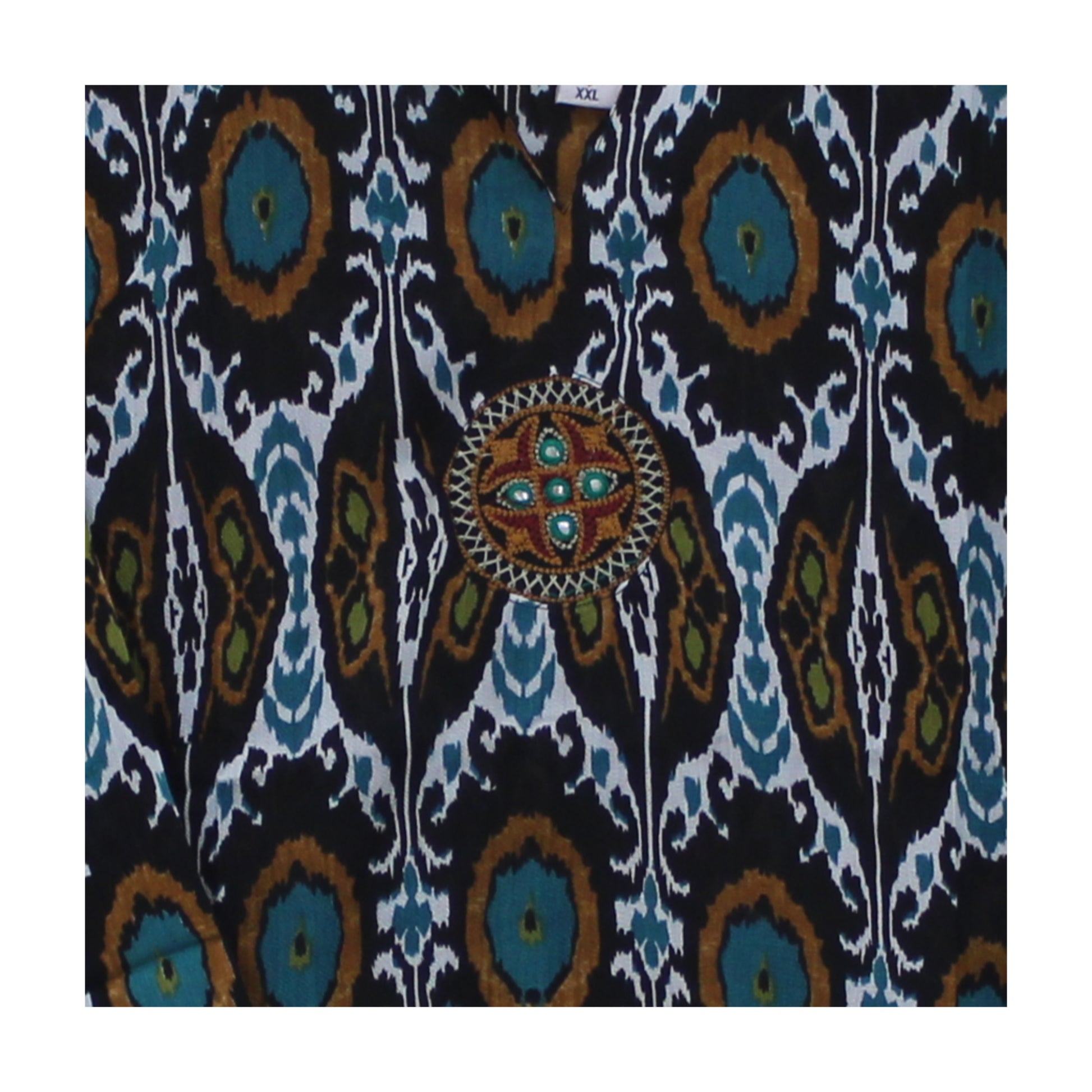 Distinctive Print: Features an all-over Ikat print with striking, rich colors (black, teal, brown) for a sophisticated ethnic look.
