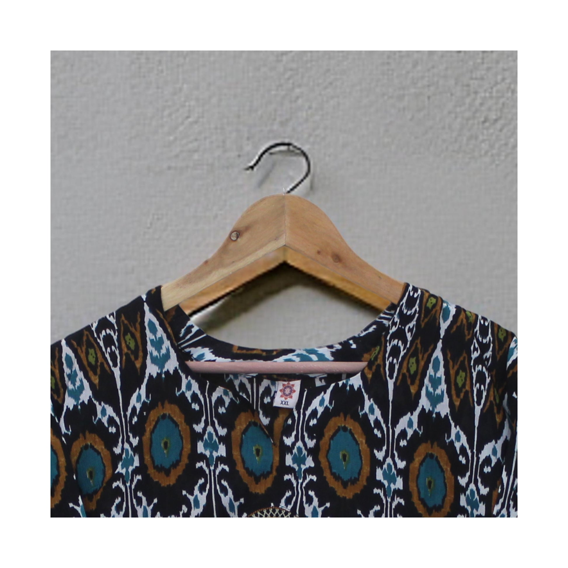 This comfortable women's tunic features a rich, eye-catching Ikat-inspired print in a bold color palette. Perfect for stylish casual wear, the top is beautifully accented with a small, unique hand-embroidered motif at the neckline, adding an effortless, artisan touch to the relaxed silhouette.
