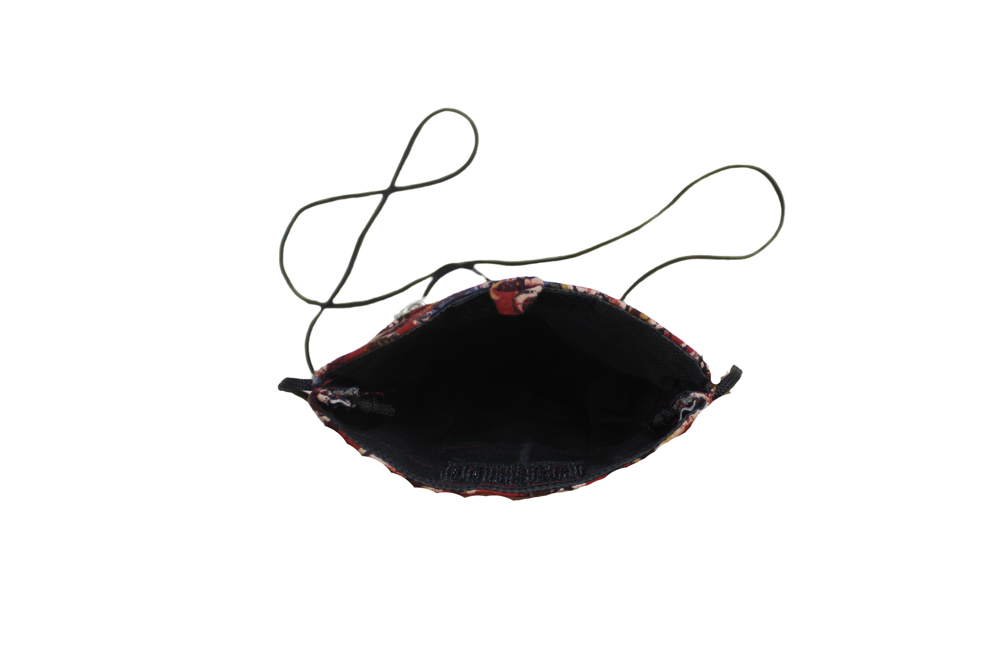 This unique handcrafted pouch measures 8 inches high by 5 inches wide, featuring a traditional block print and a central, vibrant embroidered patch. Designed for security and convenience, the main compartment is sealed with Velcro, while a separate outer zipper pocket on the back provides extra secure storage for cash or cards.