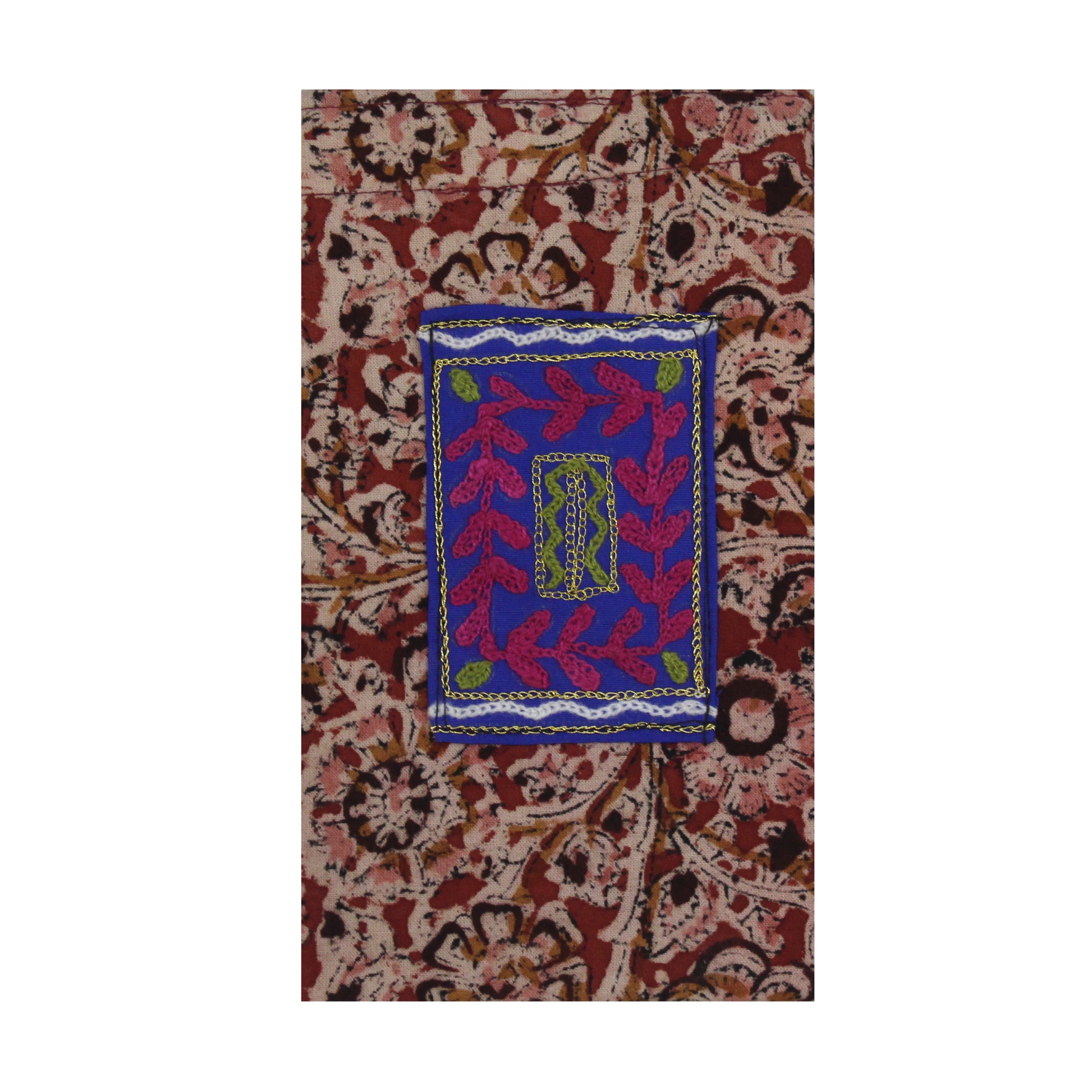 Artisan Detail: Decorated with a rich block print and a striking, colorful embroidered patch on the front.