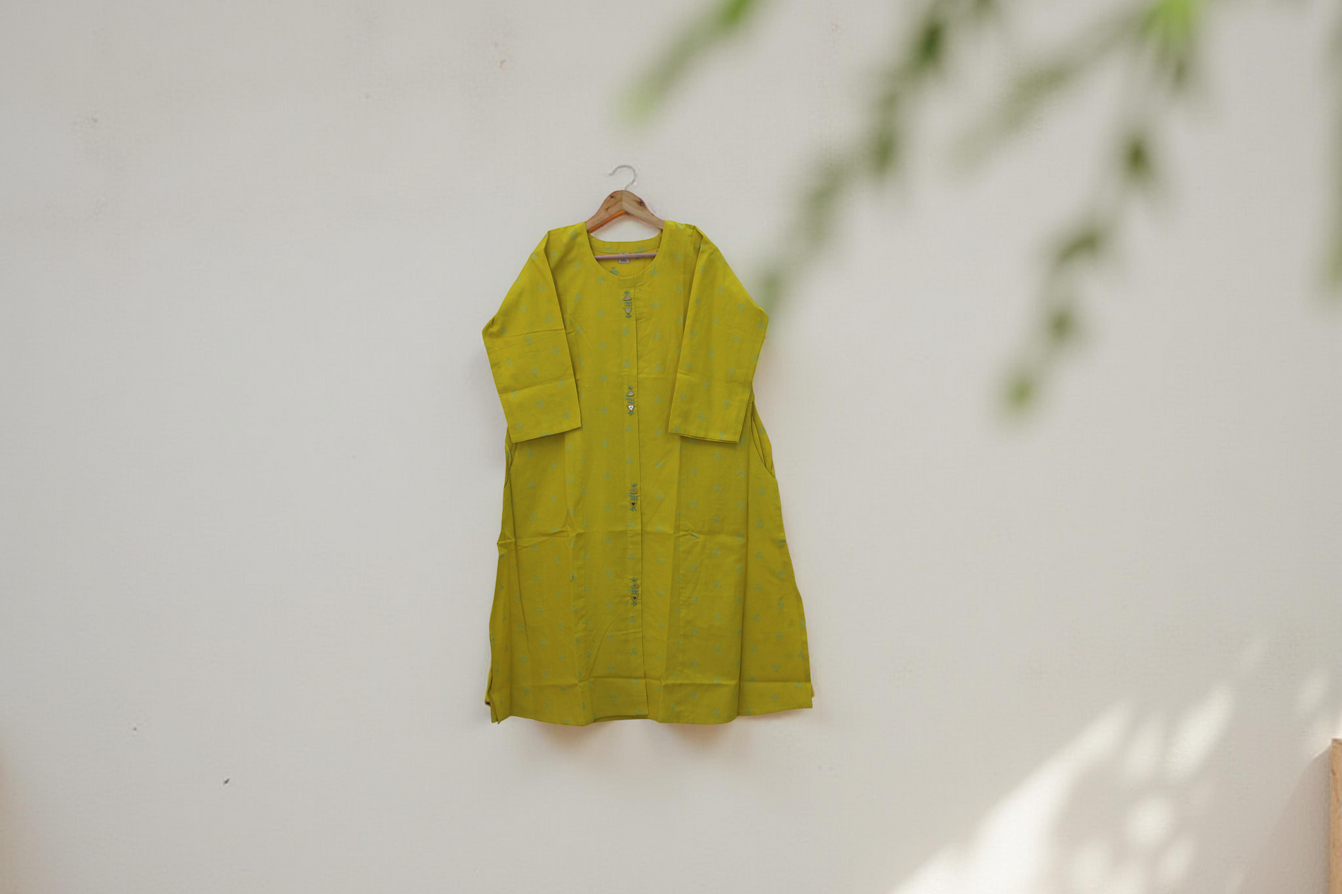 Olive Green Cotton Kurti with Mirror Detailing and Side Pockets