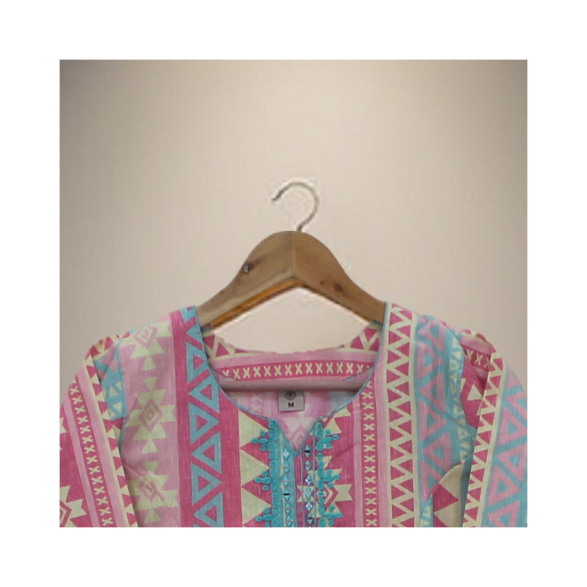 Add a pop of color to your wardrobe with this vibrant multicolor cotton kurti featuring eye-catching geometric prints in pink, turquoise, and cream hues. Detailed with elegant embroidery along the neckline and practical side pockets, it offers the perfect balance of style and comfort for everyday wear or office looks.